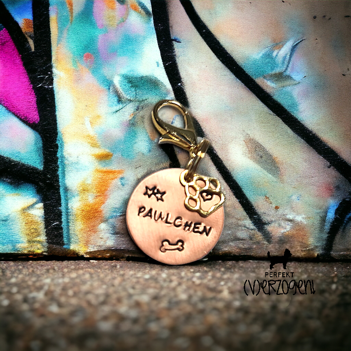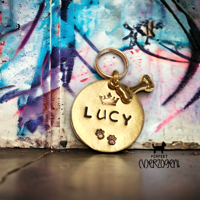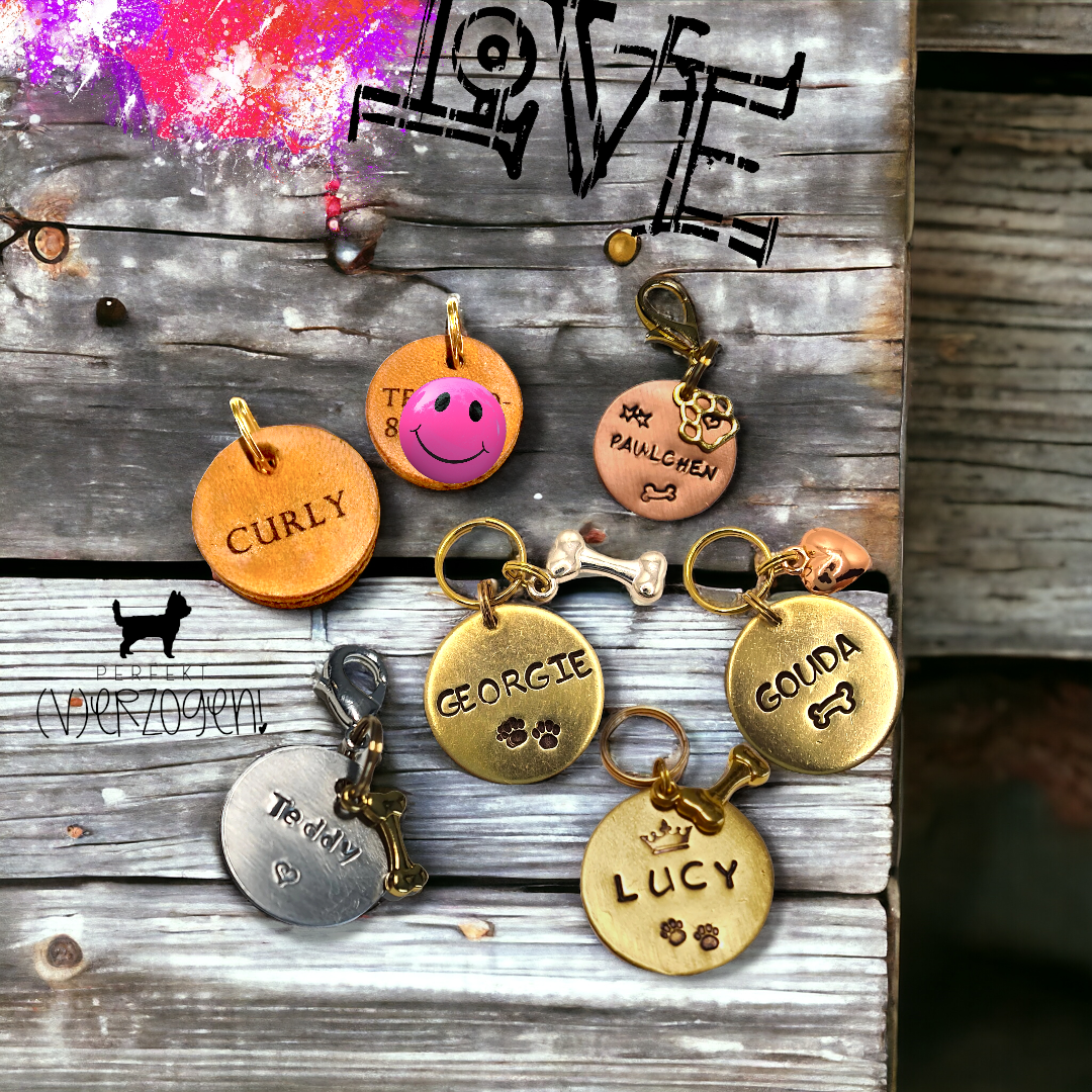 Die Hundemarken biete ich aus den Materialien Alu, Messing, Kupfer oder Leder an. Die Durchmesser lassen sich variieren von teilweise 15mm bis 30mm. Die Ledermarken sind sehr leicht, klimpern nicht, und sind in 20mm oder 25mm Durchmesser zu bekommen. Die Metall-Marken werden von Hand gestempelt, die Ledermarken stelle ich mit dem Laser her. Bei beiden gibt es eine Vielzahl von Motiven und Schriften zur Auswahl, Beispiele werden hier bald folgen.